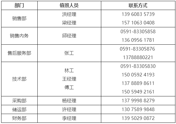 3、公司各部門值班人員及聯系方式如下:
