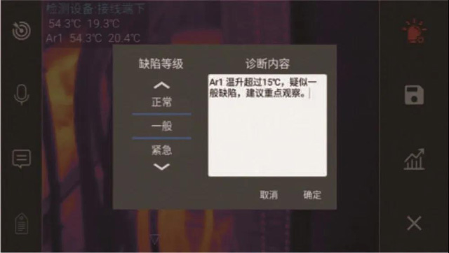 內置DL/T664-2016版的《帶電設備紅外診斷應用規范》和專家經驗;根據測試任務自動匹配相關設備診斷規則,根據診斷結論自動給予方案建議,并將診斷結論和解決方案保存于當次檢測任務內。大大降低了用戶的使用成本和學習成本,大幅提升檢測效率。