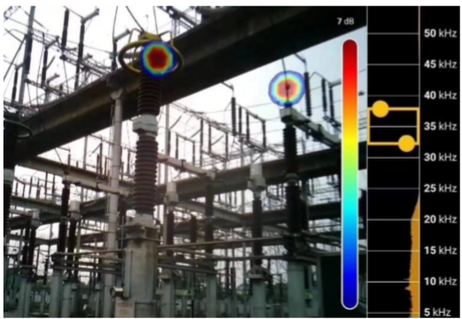 通過觸摸屏快速調整聲學成像儀的頻段,局部放電的頻段通常在30-40kHz左右,所以該聲學成像儀的頻段設置在32.5kHz-37.5kHz(黃色框),既能清晰地反映出局部放電的位置,又可以有效屏蔽現場的噪聲干擾。