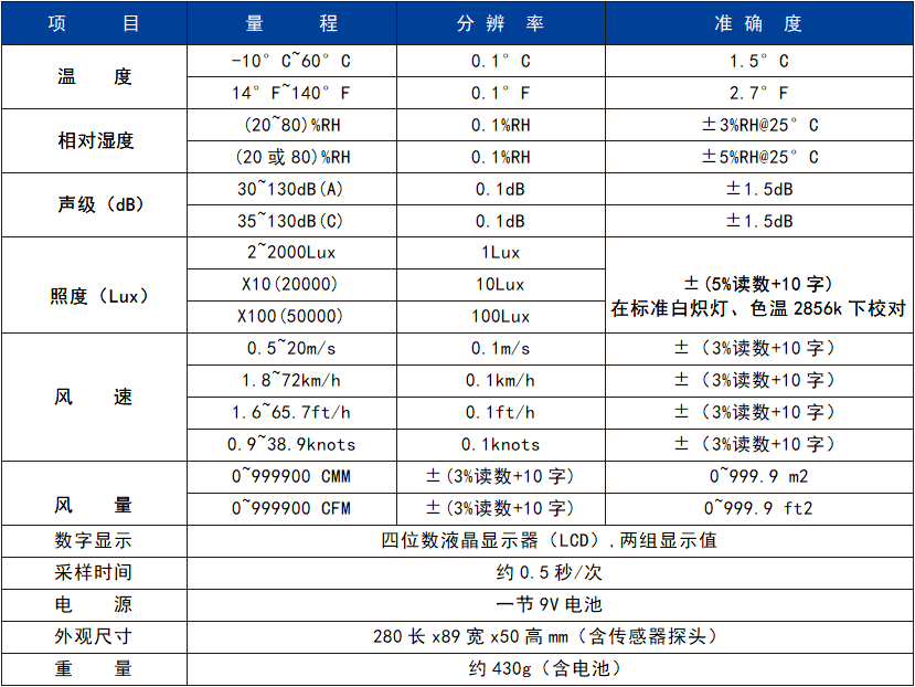 溫度、濕度、照度、風速、風量、聲級等六種測量功能
